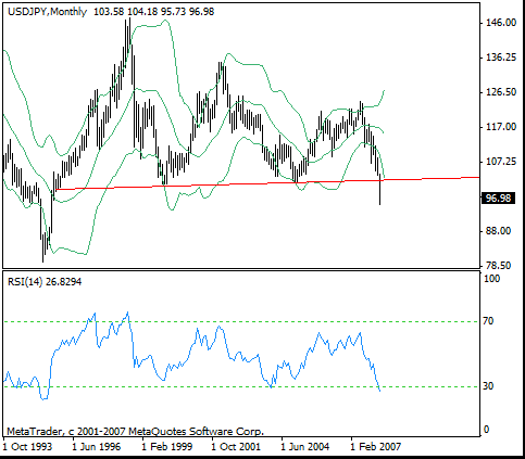 101円近くの長期サポートラインが割れましたので、今後もまだまだ下がると思う。